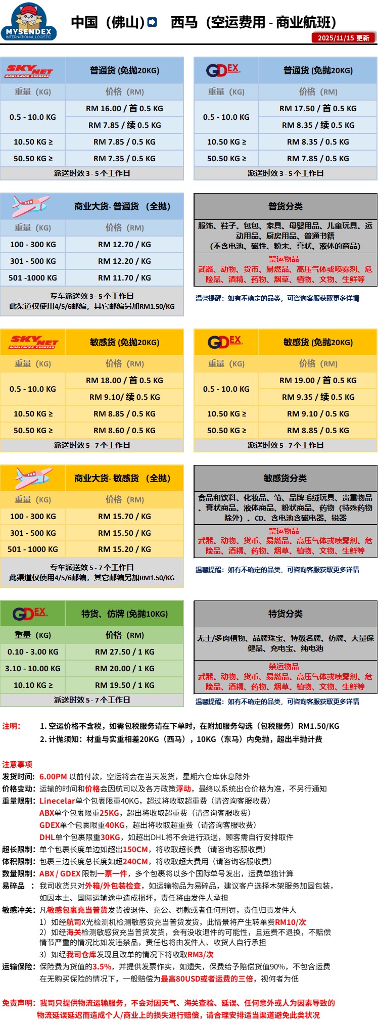 中国 -西马来西亚 (空运)价格表